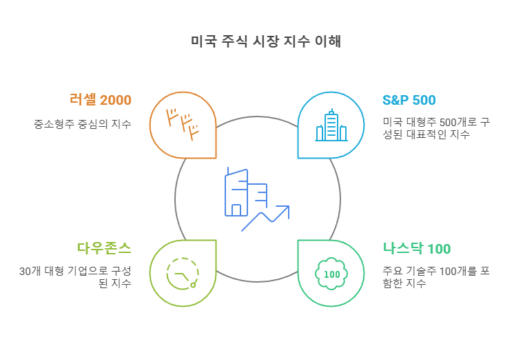 미국 지수 투자는 특정 지수를 추종하는 ETF(상장지수펀드)나 인덱스 펀드를 매수하여 시장 평균 수익률을 따라가는 투자 방식입니다. 대표적인 미국 지수는 다음과 같습니다.